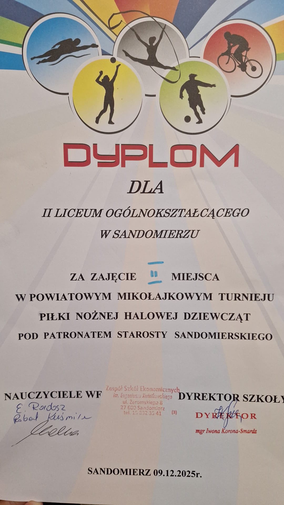 Miło nam poinformować, że nasze zawodniczki zajęły II miejsce w Powiatowym Mikołajkowym Turnieju Piłki Nożnej Halowej Dziewcząt organizowanym przez Ekonomik Sandomierz pod patronatem Marcin Piwnik - Starosta Sandomierski