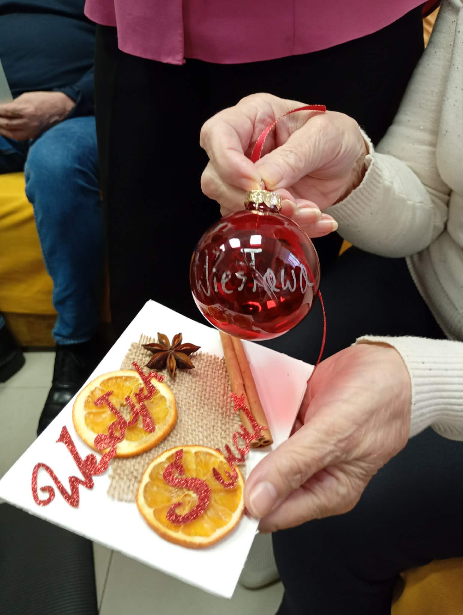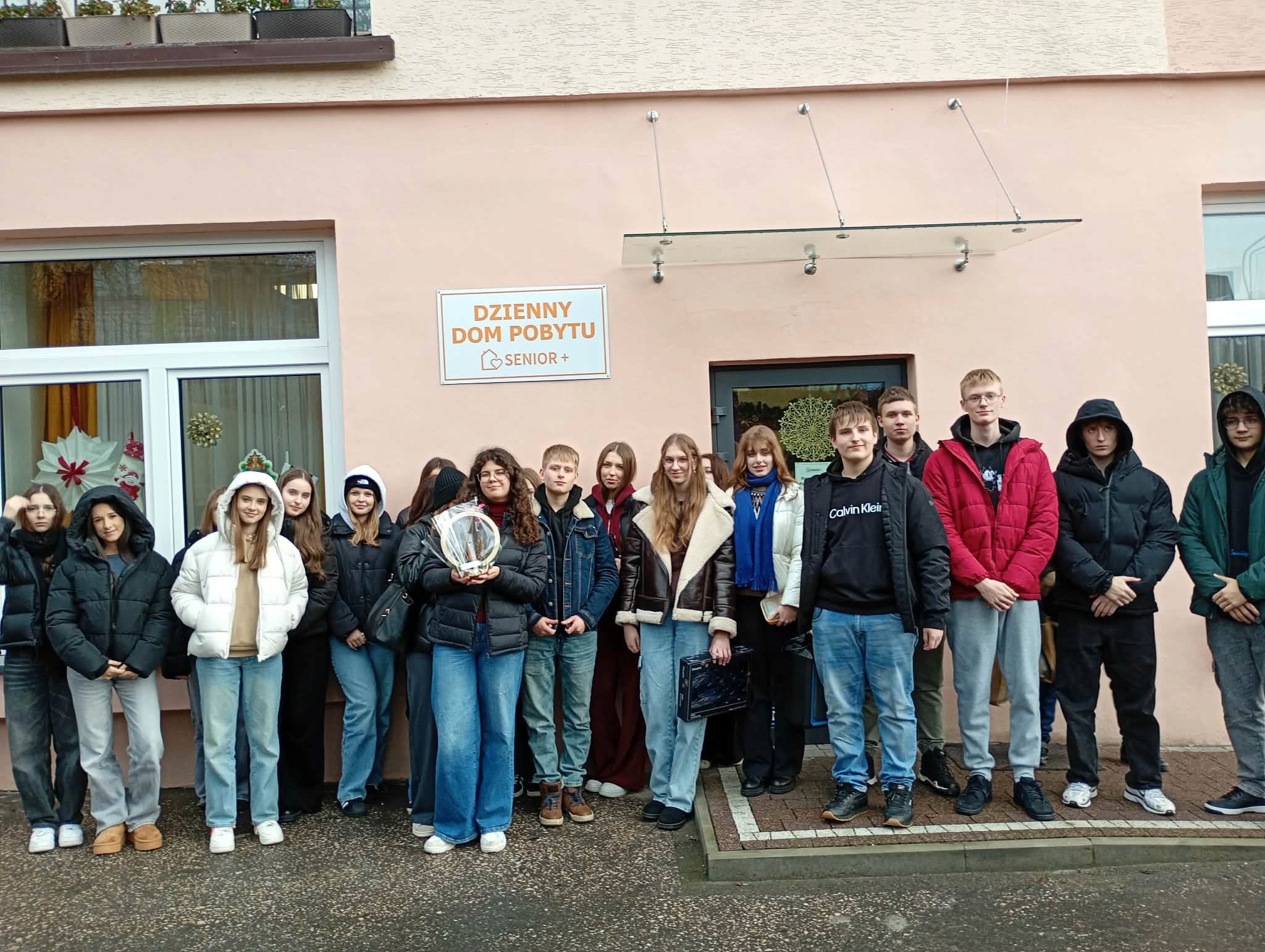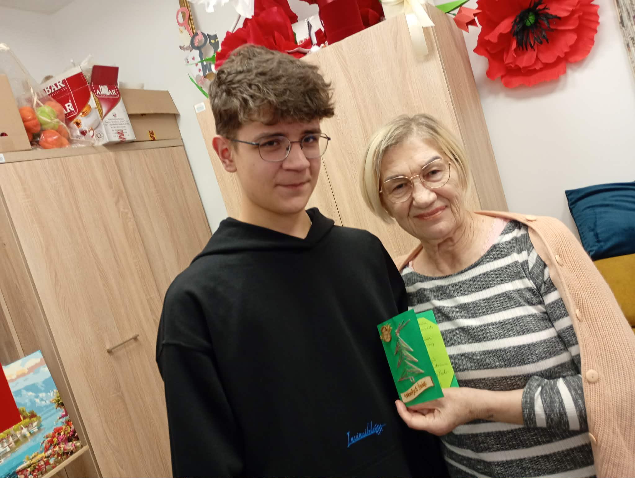 „Dzielimy się dobrem” - tak uczniowie klasy 1 bm określili dzisiejsze spotkanie w Dziennym Domu Pobytu Senior + w Sandomierzu. Występ wokalny Marty Kuneckiej, wspólne śpiewanie kolęd, wręczenie samodzielnie wykonanych przez młodzież kart ze świątecznymi życzeniami oraz bombek choinkowych autoryzowanych imieniem, a przede wszystkim rozmowy i wspólnie spędzony czas wzruszył seniorów do łez.