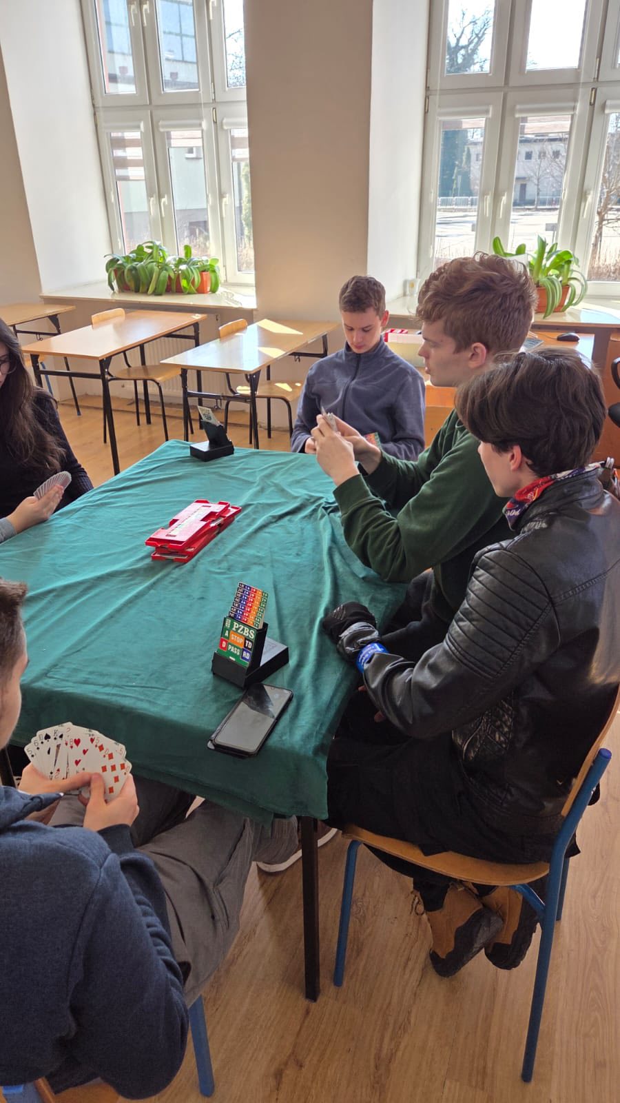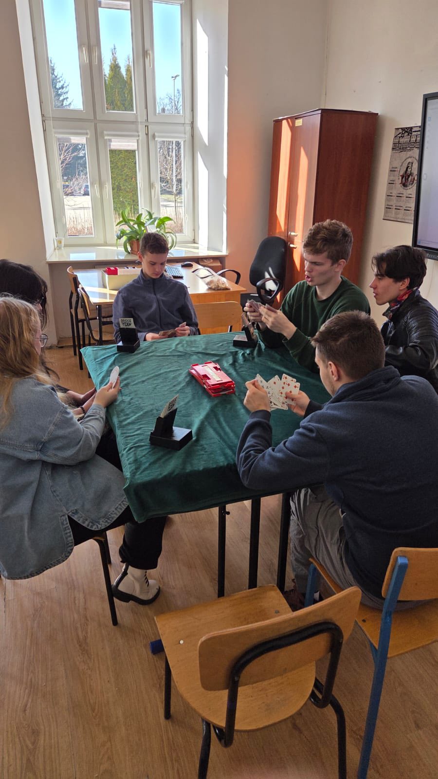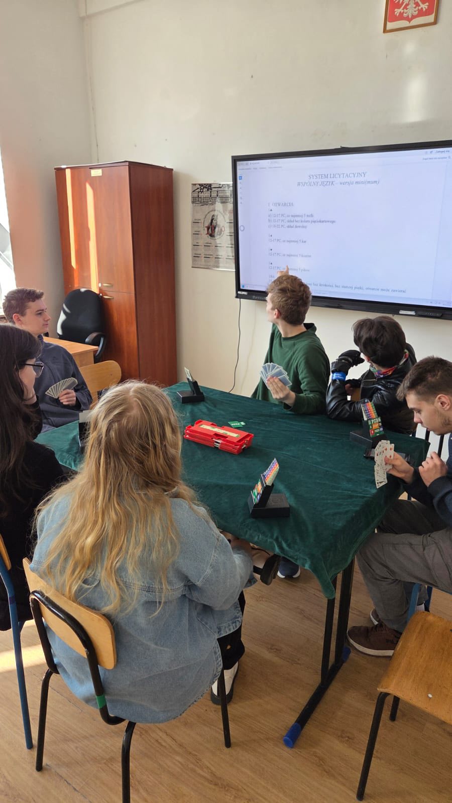 W wolnym czasie nasi uczniowie doskonalą grę w brydża. Tym razem tematem przewodnim były uzgodnienia licytacyjne w systemie „wspólny język”. Ostatnie spotkanie zaowocowało dołączeniem do zespołu dwóch nowych członków - Kuby z klasy IV b i Mikołaja z klasy III c. Witamy i życzymy samych szlemów. Cały czas czekamy na jakąś konkurencję, bo póki co jesteśmy jedyną szkołą w powiecie sandomierskim z kołem brydżowym a chętnie wzięlibyśmy udział w jakimś turnieju.