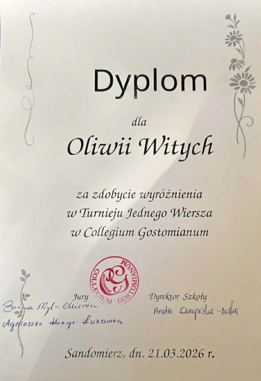 Miło nam poinformować, że w „Turnieju Jednego Wiersza” uczennica klasy III e – Oliwia Witych otrzymała wyróżnienie.