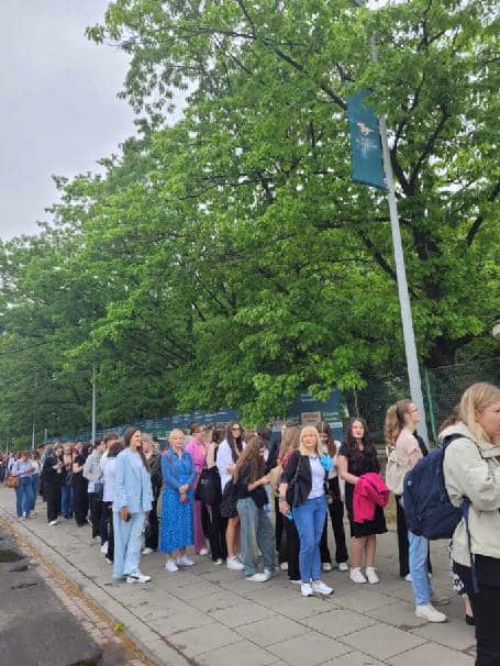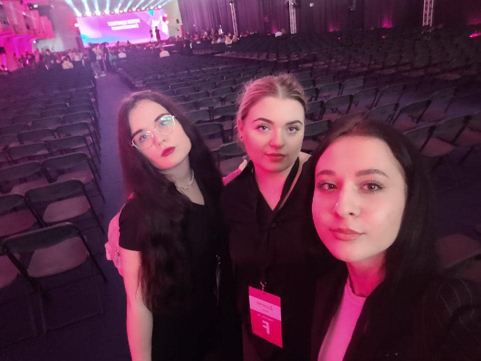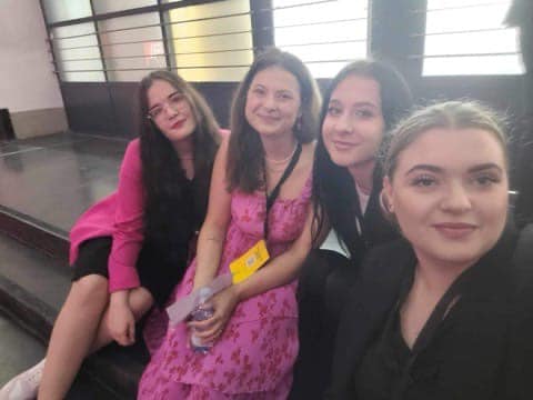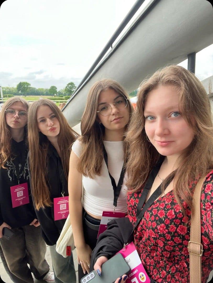 Pierwsza grupa uczniów w składzie: Roksana Pacholczak, Aleksandra Kaczmarska, Zuzanna Marzec, Wiktoria Moskal, Aleksandra Skrok i Dima Laszczenko