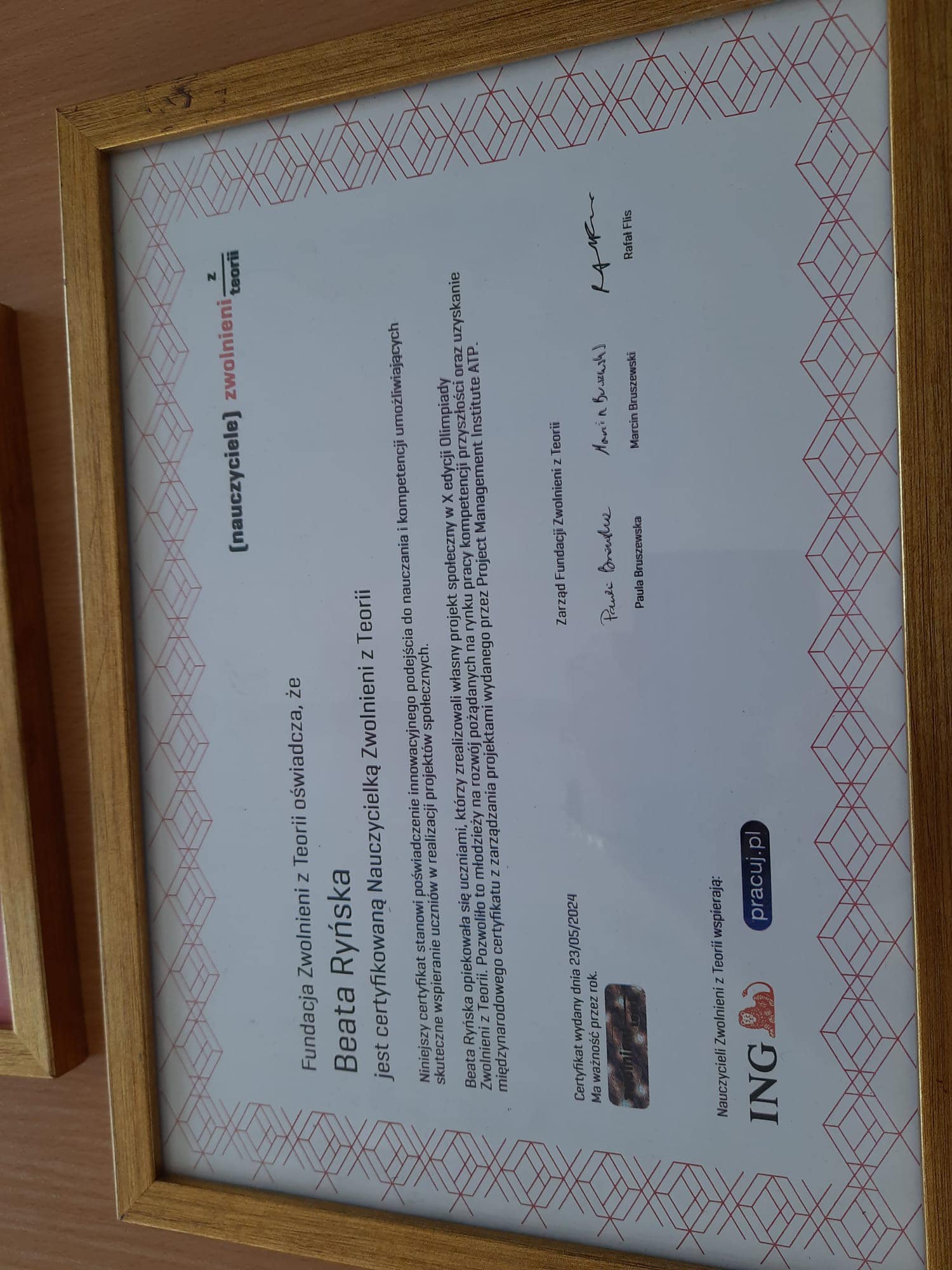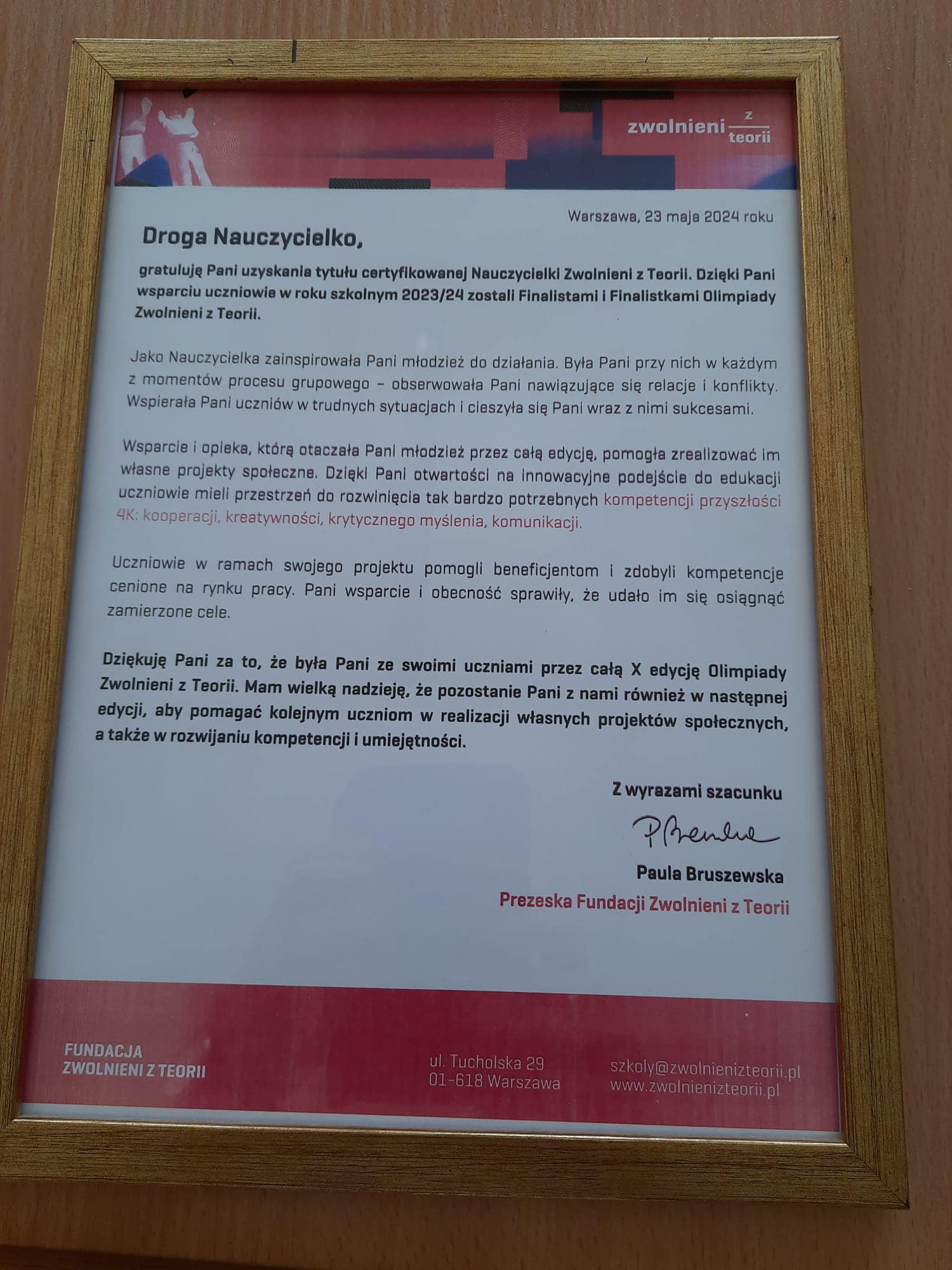 23 maja 2024 r. nasi uczniowie wzięli udział w X Wielkim Finale Zwolnionych z Teorii w ramach pierwszej w Polsce zespołowej pozaszkolnej olimpiadzie projektów społecznych dla studentów i uczniów szkół ponadpodstawowych. Zwycięzcy autorskich projektów walczyli o wyróżnienie Złotych Wilków. Tegoroczna uroczystość odbyła się na Torze Wyścigów Konnych Służewiec w Warszawie. Finał był podsumowaniem corocznych projektów społecznych zrealizowanych w X edycji Olimpiady Zwolnieni z Teorii. To wielkie wydarzenie uświetniają swoją obecnością politycy, samorządowcy, przedstawiciele świata biznesu i organizacji społecznych działających w Polsce. Ideą Zwolnionych z Teorii jest wspieranie młodzieży we współczesnej edukacji tzn. kształtowanie kompetencji przyszłości 4K: kooperacji, kreatywności, krytycznego myślenia, komunikacji.